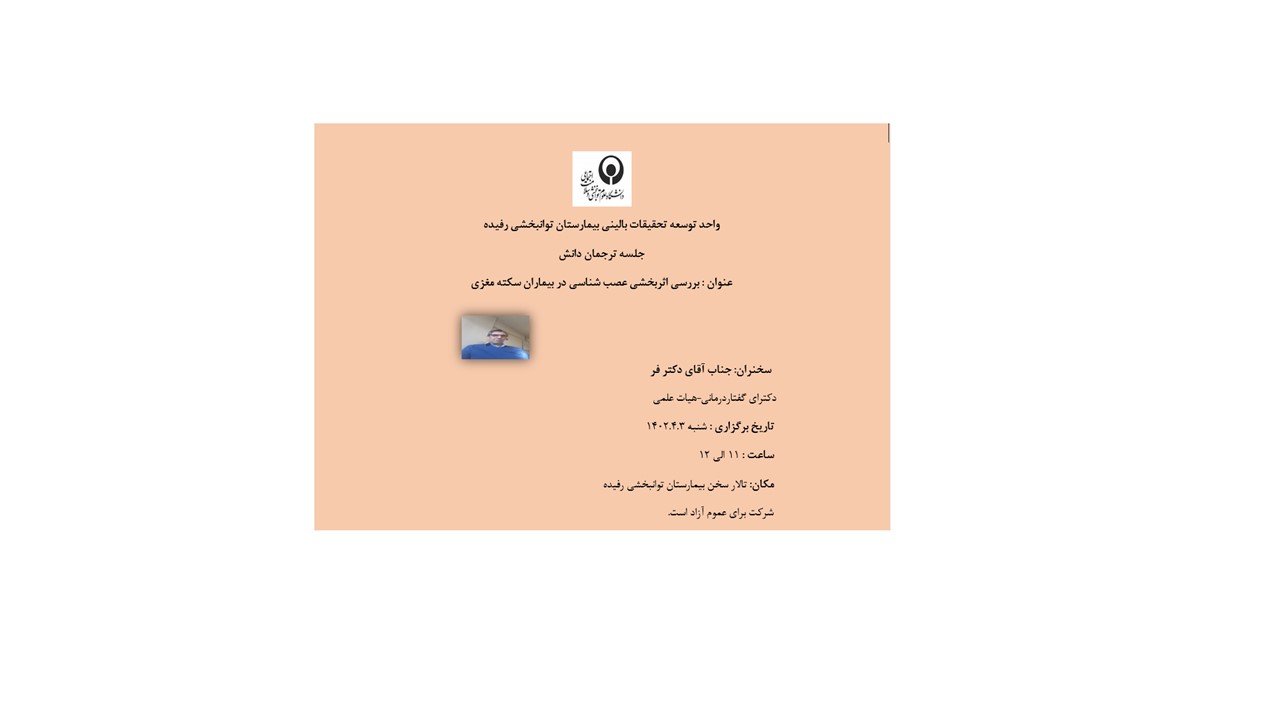 واحد توسعه تحقیقات بالینی در نظر دارد جلسه ی ترجمان دانش خود را ویژه ی طرح جناب آقای دکتر فرازی و همکاران (۱۴۰۲) با عنوان «بررسی اثربخشی عصب شناسی در بیماران سکته مغزی» در روز شنبه مورخ سوم تیرماه ۱۴۰۲ در تالار سخن بیمارستان رفیده برگزار کند. از کلیه ی اساتید، پژوهشگران و علاقمندان دعوت می شود در این همایش شرکت نمایند و شرکت برای عموم آزاد است. شایان ذکر است به سخنرانان در جلسات ترجمان دانش گواهی نامه از طرف معاونت تحقیقات و فناوری دانشگاه علوم توانبخشی و سلامت اجتماعی اهدا خواهد شد.