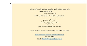 شرکت در کارگاه پروپوزال نویسی با تدریس خانم دکتر مریم ترابیان، برای عموم افراد وابسته به دانشگاه علوم توانبخشی و سلامت اجتماعی رایگان بوده و بصورت حضوری و مجازی برگزار می گردد و همراه با دریافت امتیاز آموزشی می باشد . لینک شرکت در کارگاه مجازی به شرح زیر می باشد و جهت اطلاعات بیشتر با واحد توسعه تحقیقات بالینی بیمارستان توانبخشی رفیده تماس فرمایید. https://connect.uswr.ac.ir/rofeidehresearch Email: Rofeidehresearch@uswr.ac.ir