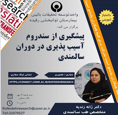 در راستای برنامه ی انتشار نتایج پژوهش های انجام شده در مرکز، جلسه ی ترجمان دانش ویژه ی طرح سرکارخانم دکترژاله زندیه و همکاران با عنوان «پیشگیری از سندرم آسیب پذیری در سالمندی» در روز سه شنبه مورخ چهارم مهرماه ۱۴۰۲ با حضور اساتید محترم، همکاران و دانشجویان گرامی در تالار سخن بیمارستان رفیده برگزار خواهد شد.