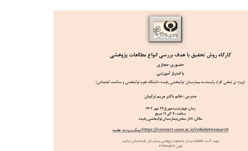 کارگاه روش تحقیق با هدف معرفی انواع مطالعات در پژوهش روز چهارشنبه مورخ ۲۶ مهر ۱۴۰۲ ساعت ۹ الی ۱۱ در تالار سخن بیمارستان توانبخشی رفیده با تدریس دکتر مریم ترابیان بصورت حضوری-مجازی همراه با امتیاز آموزشی برگزار خواهد شد.