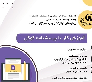 به گزارش واحد توسعه تحقیقات بالینی کارگاه آموزش ساخت و کار با پرسشنامه گوگل برگزار شد کارگاه آموزش ساخت و کار با پرسشنامه گوگل روز یک شنبه مورخ ۱۹شهریورماه ۱۴۰۲ ساعت ۱۰ الی ۱۲ در تالار سخن بیمارستان توانبخشی رفیده با تدریس آقای مهندس احمد سلیمی بصورت حضوری-مجازی و با مشارکت سه دانشگاه علوم توانبخشی و سلامت اجتماعی، دانشگاه علوم پزشکی ایران و علوم پزشکی شهیدبهشتی برگزار شد. | |